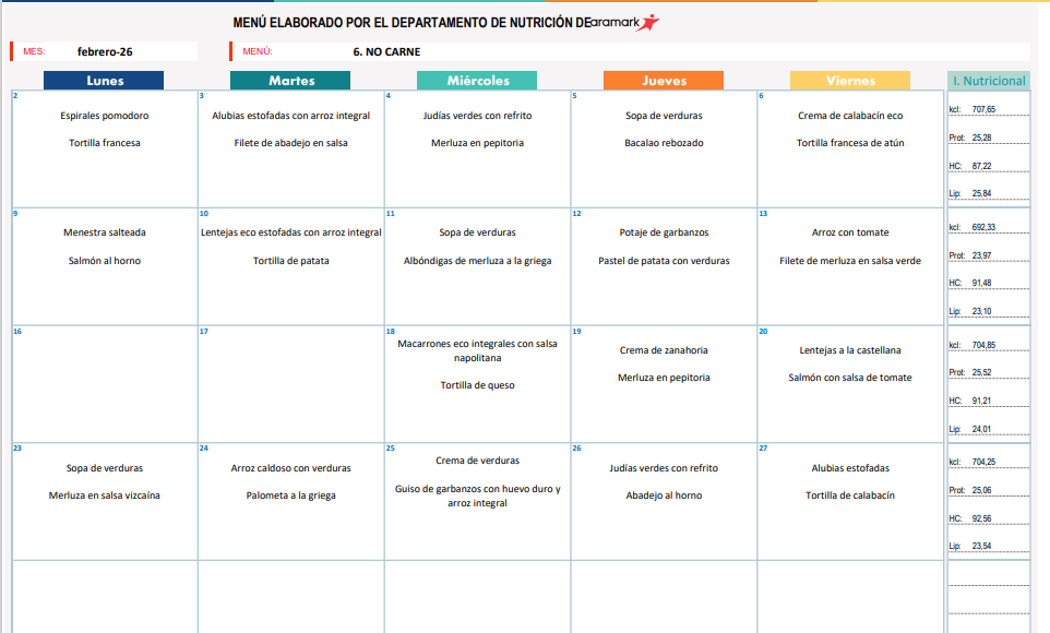 MENÚ SIN CARNE FEBRERO 2026